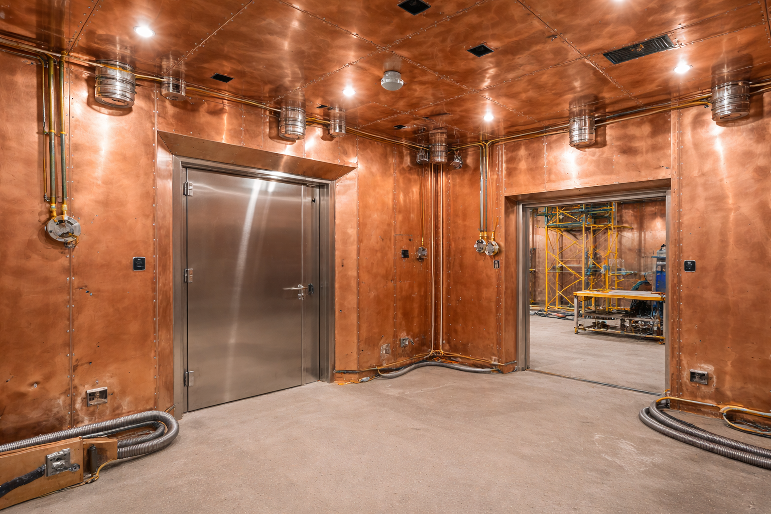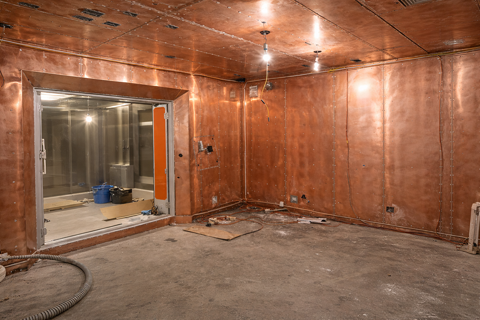 A continuous copper layer is applied to walls, ceiling, and sometimes the floor. All seams are overlapped or soldered/bonded, then electrically tested. Penetrations are sealed using approved RF components and detailing.