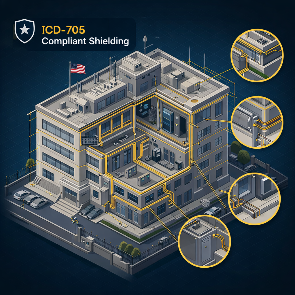 TEMPEST shielding and ICD-705 are related but not identical. ICD-705 defines requirements for SCIF construction and accreditation. TEMPEST shielding may be included within an ICD-705 SCIF project when the program’s EMSEC requirements call for it. In practice, TEMPEST design work is coordinated as part of the broader ICD-705 SCIF scope when applicable.